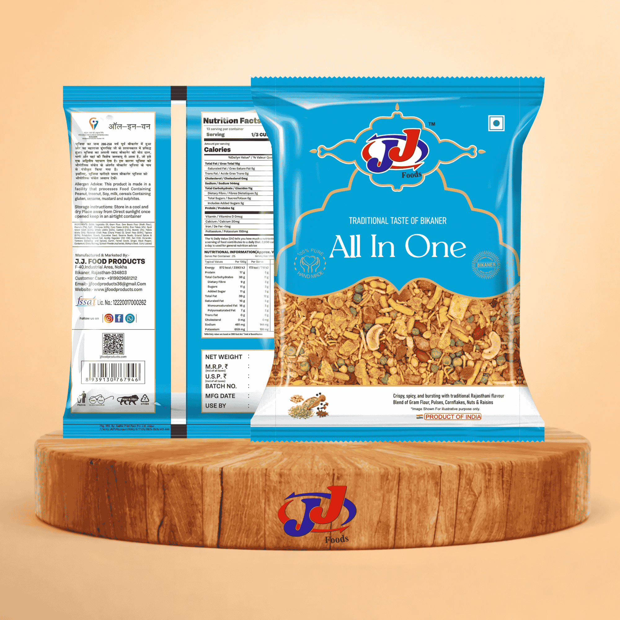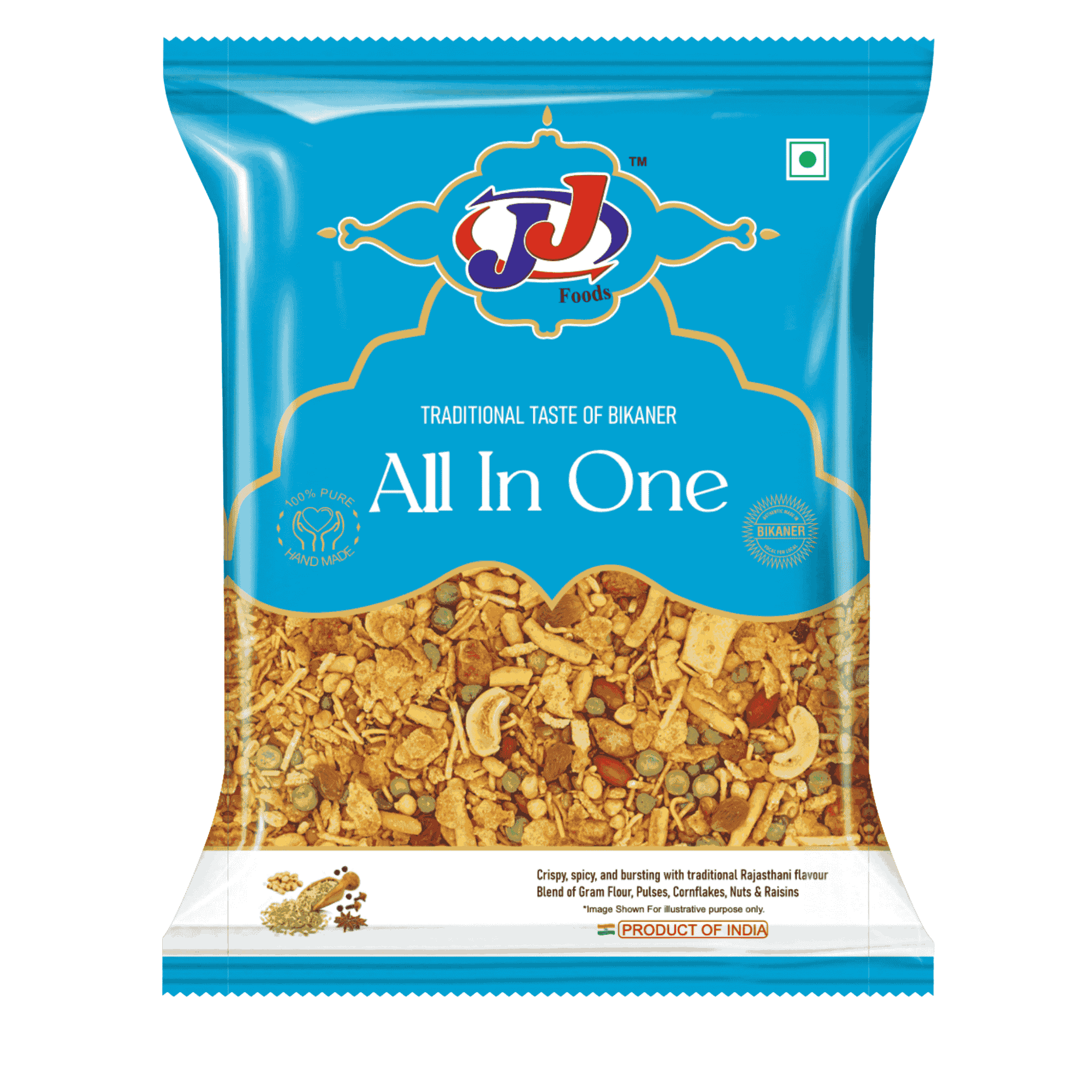 At JJ Food, we focus on delivering traditional snacks with consistent quality and authentic taste. Our mission is to provide customers with a premium snacking experience that reflects the richness of Indian namkeen culture. Each pack of All In One Namkeen is prepared with attention to detail so you can enjoy the same great taste every time.