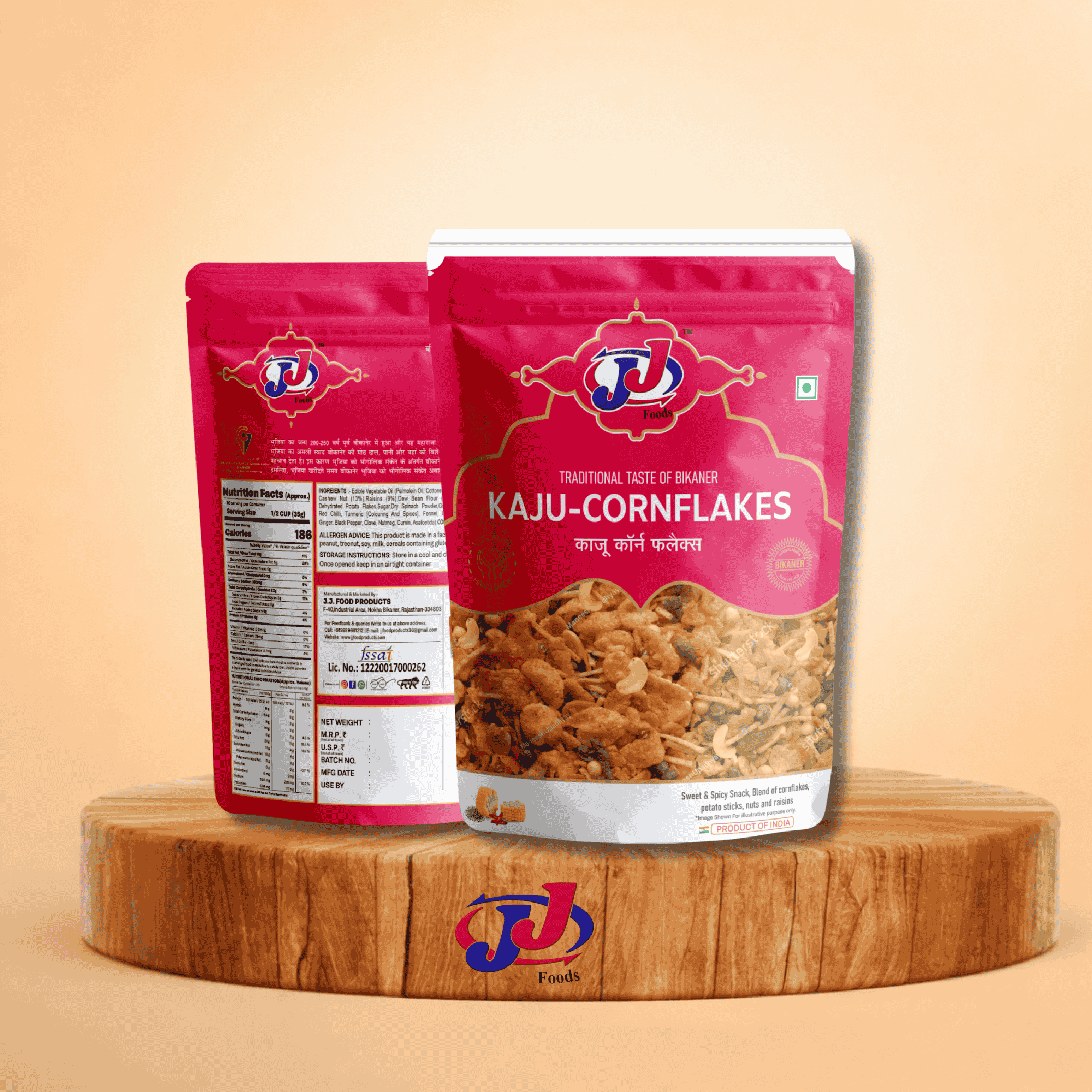 JJ Food prepares this mixture using high-quality ingredients to ensure great taste and freshness. The cornflakes are fried to achieve the perfect crispiness, while premium cashews add richness and a slightly nutty flavor. Roasted peanuts, fried lentils, and traditional spices enhance the taste and create a perfect balance of crunch and flavor in every bite.
